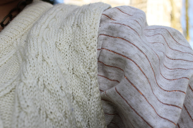 Why this Outfit Works: The rule of three is adhered for this outfit. The rule of three to me lately has been three patterns that work together or three differnet layers. The vest adds that extra layer and is in the same colour scheme as the striped shirt. I love the rule of three's and pattern on pattern lately. I think the striped 3/4 shirt, the cable knit sweater and the hair scarf make up the rule of three.