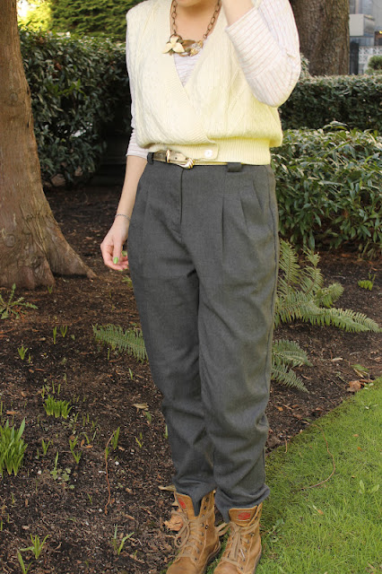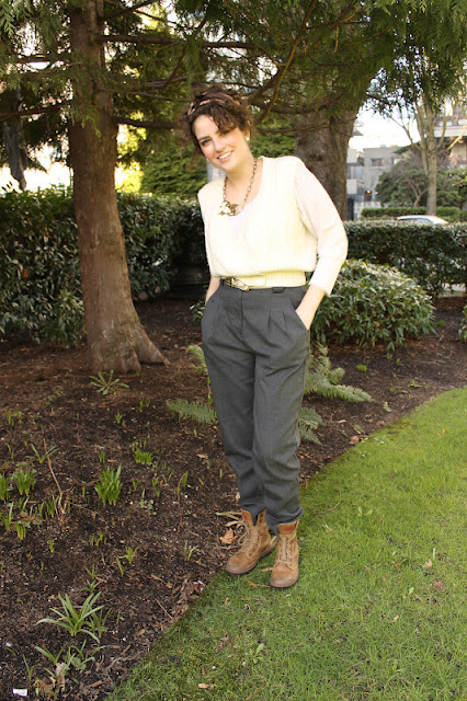 A different version: For a more subdued look. Take off the cable knit sweater vest and just wear the cropped shirt either tucked in or out. I wouldn't suggest ditching the belt, I think a belt finishes off any trouser pant and outfit. You don't have to Hattify your outfit and put an edge with the hiking lace up boots. You can simply wear some black ankle booties, tuck your trousers in to your booties and voila you have yourself a more subdued version of my outfit. Don't forget your Hattitude necklace!