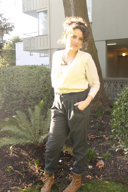 I wanted to wear my trouser high wasited pants, since it was only 6 degrees out, to keep my core organs all nice and toasty warm. My striped 3/4 length cropped shirt looked good with the outfit, I could have stopped at just that, but the outfit was not yet Hattified. I added the cable knit vest on top...almost was enough, but to quirk it up some more I put the lace up boots with the trousers. It's different and gives it that edge and flair that I like to have. I had bed hair, so I grabbed a scarf and put it on. Voila, that's JUST enough. Outfit has now been Hattified.
