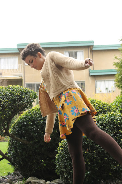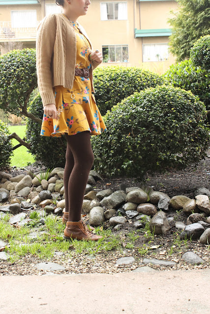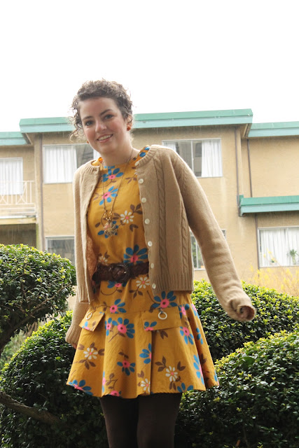 Why this Outfit Works: Someone might have looked at that loud and retro dress and thought there was no way to work this piece. I looked at it and saw a little bowl of ice cream with some maple syrup on top. I loved it. Put it with some plain brown tights, and a plain (different texture) sweater, and this outfit works.