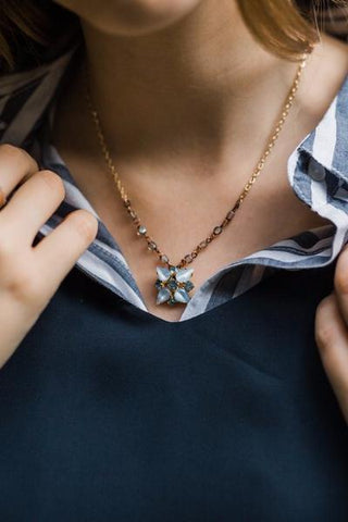 vintage inspired gold and blue sapphire dahlia brooch necklace